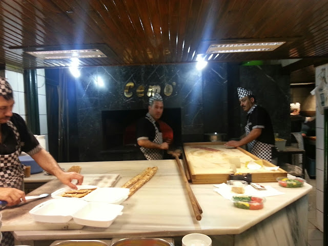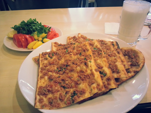 Ben klasik olan Etli Ekmeği denemek istedim. 180 gr hamura 100 gr et ve 100 gr sebze konularak yapılıyormuş. Kullanılan etler düvenin kaburga ve boşluk kısmından alınıyormuş. 90 cm uzunluğunda ustası tarafından çeke çeke uzatılan hamur 3-4 dakika taş fırında pişip servis ediliyor.