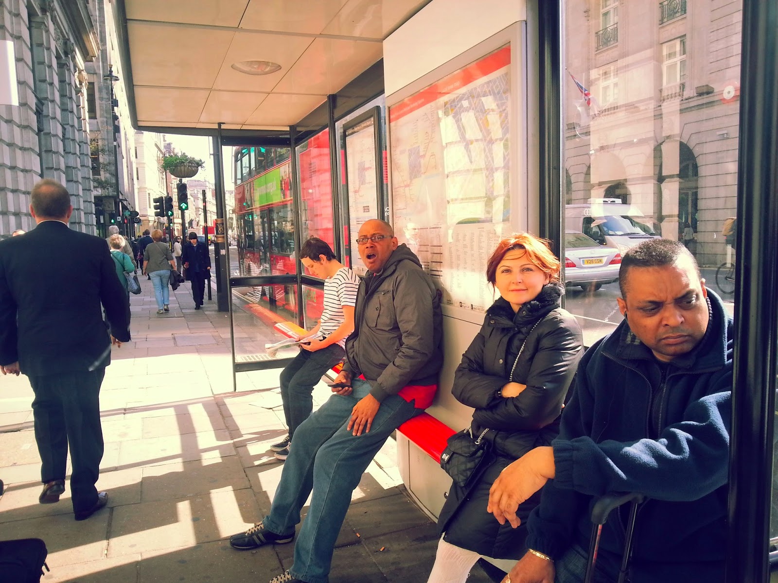Londra’daki otobüs duraklarını ise iyice bir incelemek gerekli. Çünkü durağın her bir yerinde önemli bilgiler var. Ancak hemen belirtmek isterim ki duraklar nedense ters duruyor. Evet durakta beklerken oturduğunuz yer sırtınızı yola dönmeniz gerektiriyor ki bu işin sebebini anlayamadım.