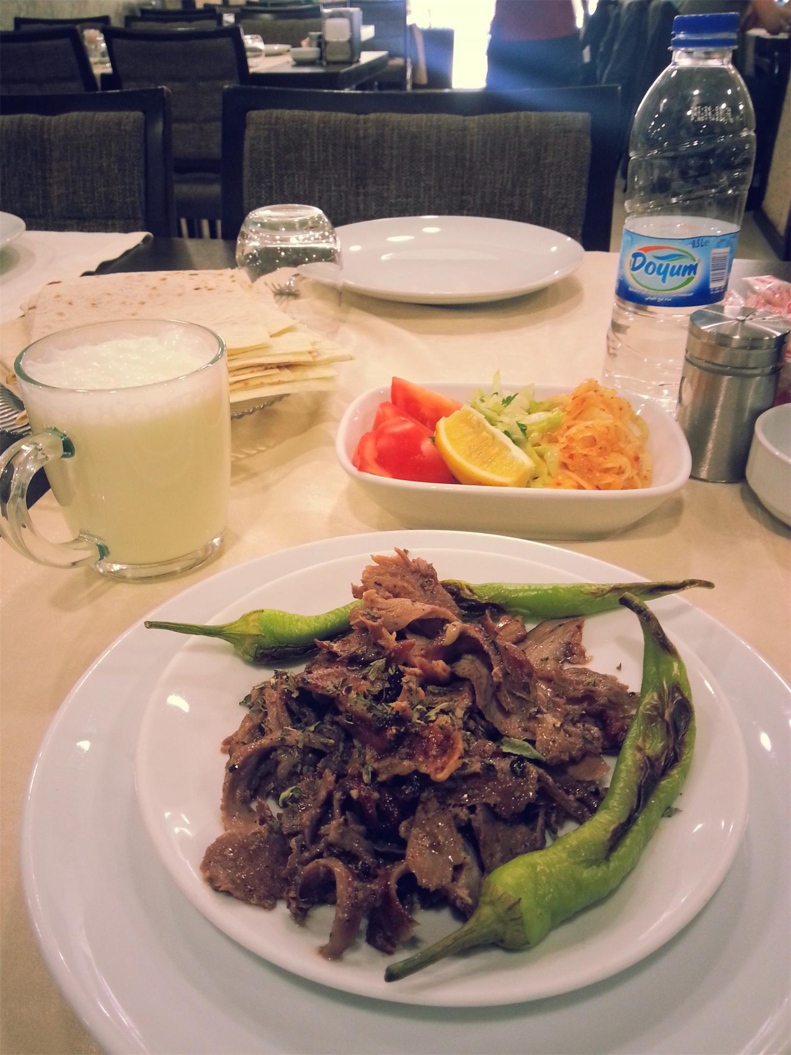 Döner İzmir-İstanbul’dan farklı olarak sade bir şekilde tabakta geliyor. (Benzer bir lezzeti Samsun Saathane Meydanında Lezzet Dönercisi’nde karşılaşmıştım) Döner tabağının yanına yine Çağ Kebapta olduğu gibi eşlikçiler ve ince lavaş geliyor. Eşlikçilerin içinde az pişmiş soğan 10 numara geldi.