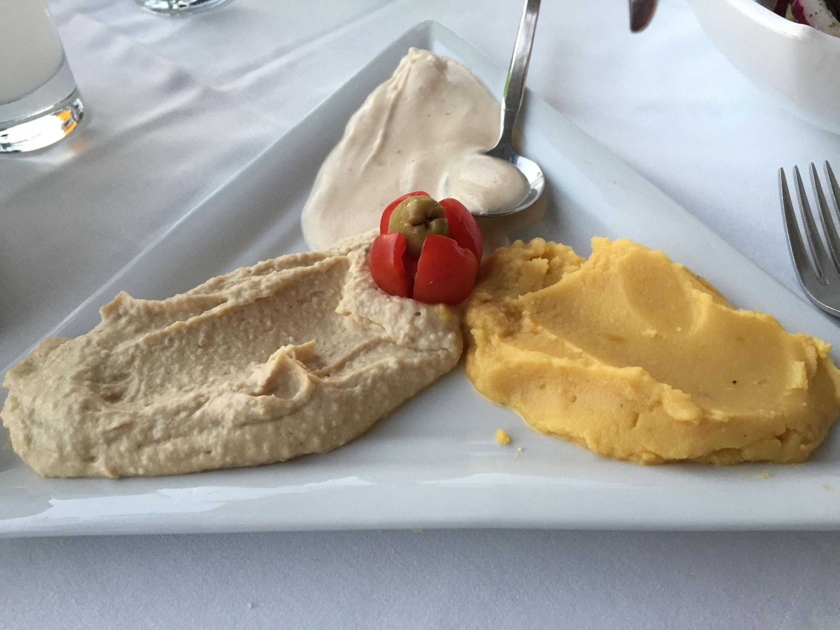 Salatanın Yanına Yunan Tabağı dedikleri karışık bir meze tabağı aldım. İçinde Yunan usülü humus, fava ve tarama vardı.