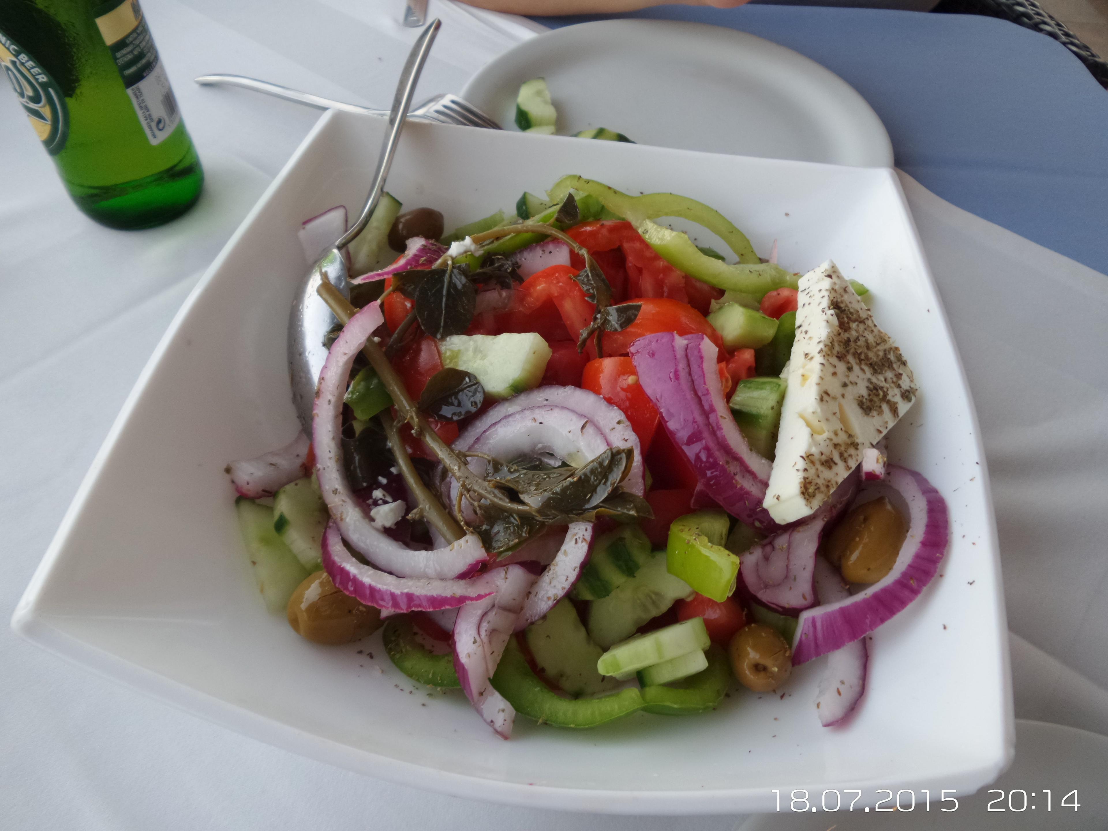 Bir Hafta önce Kos, sonrasında 4 gün Rodos derken bir tane Grek Salata yememiş olduğumuzu fark edip ilk olarak Grek Salata istedik. Tembel Yunanlıların, domatesi, salatalığı, biberi, soğanı küçük doğramakla uğraşmadan kocaman kocaman kesip üzerine de her şeye gideri olan Feta peynirini yerleştirdikleri ve Ege Zeytinyağı ile sirke veya limon ekşisi ile bütünleştirip dünyaya armağan ettikleri meşhur bir salata bu Grek Salata. Biz daha kaşık salata, gavur salata ile uğraşalım duralım 🙂