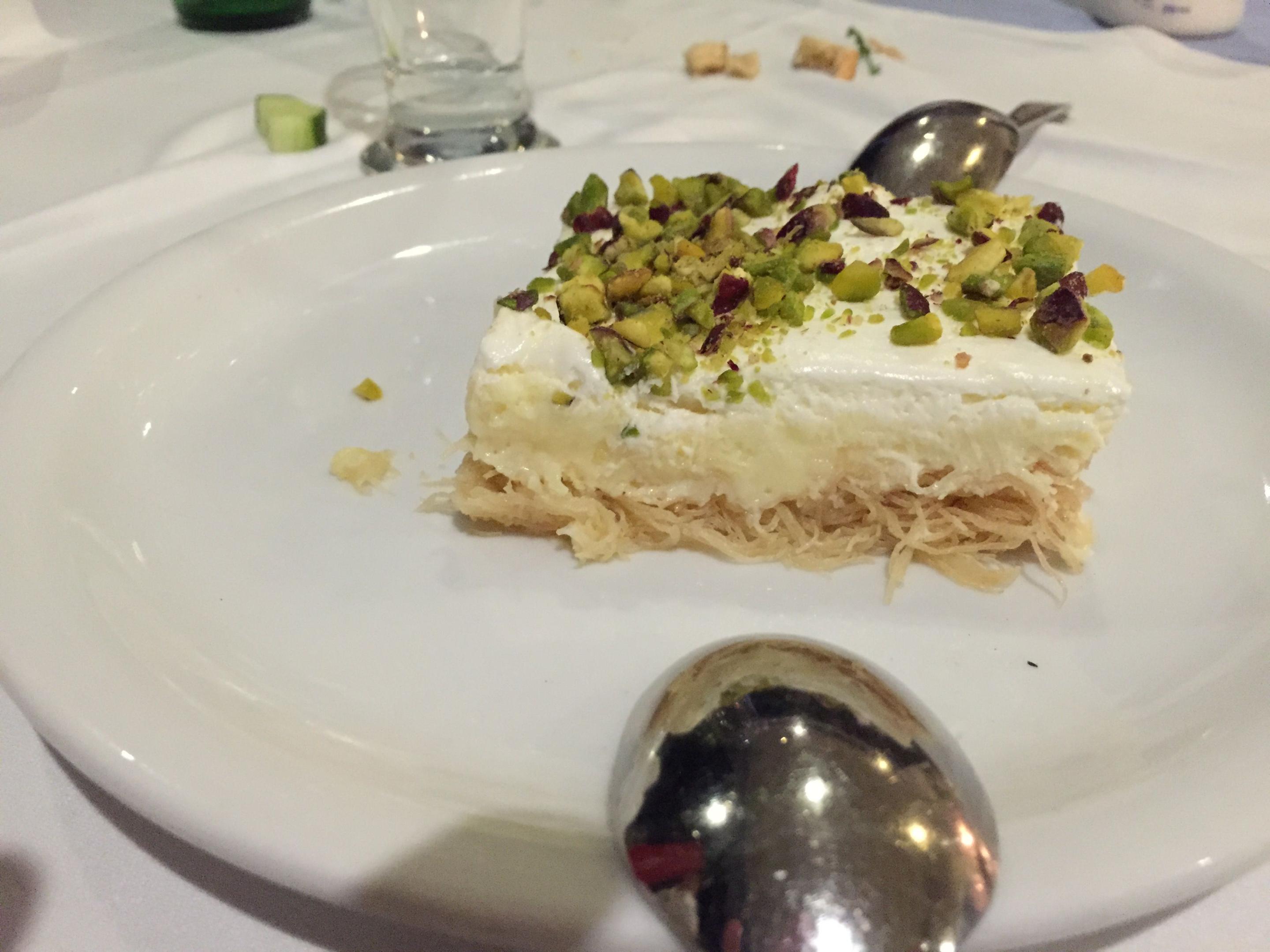 Tatlı olarak ne var diye sorduğumda garson bize "Sizin tatlınız Kadayıfımız var, Ancak bizim usulümüzle" dediğinde hadi bir deneyelim dedim ama ne kadar farklı olur ki, bize mahçup olmamak için böyle dedi diye de düşünmeden edemedim. Ancak tatlı geldiğinde yanıldığımızı anladık, Gerçekten de güzel pişmiş bir kadayıf ancak üzerinde kalınca bir tabaka lezzetli bir krema ve tepelerine serpiştirilmiş antep fıstığı, kadayıfı başka bir tatlı haline getirmişti. Kadayfın şerbetli tatlı olması sebebi ile doğal ağırlığı, hafif krema ile dengelenmiş ve ortaya güzel bir füzyon çkmıştı, tavsiye ederim.