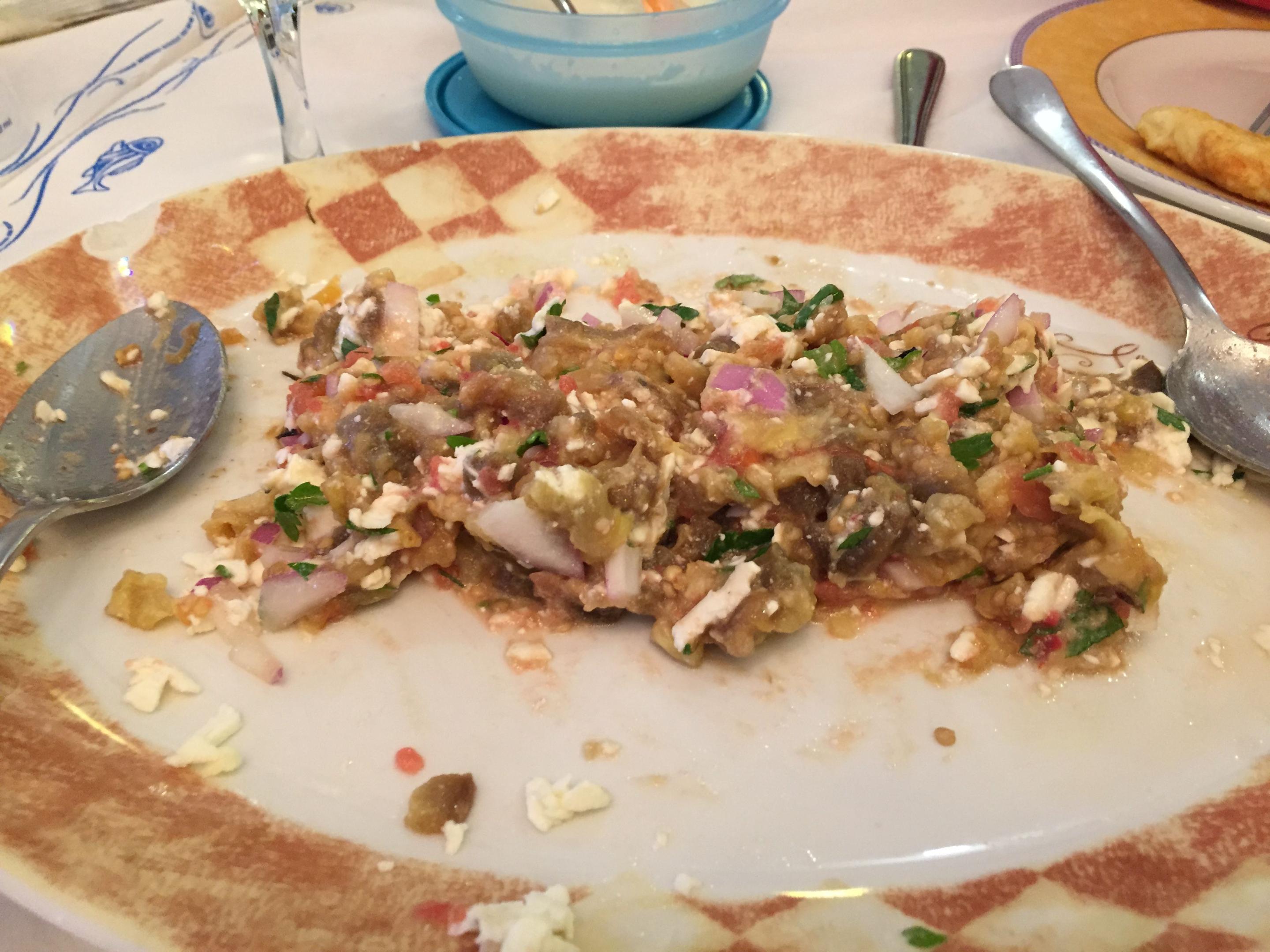 Közlenmiş  patlıcan salatası istemiştik ama garsonun uyarısı ile Izgarada közlenmiş ve içine feta peyniri, soğan, domates konularak yapılan enfes bir ara sıcak geldi. Tavsiye edeirm. Özellikle Patlıcanın bozulmadan masaya getirilip garson tarafından mezenin masada hazırlanması olayın görsel bir şuvu idi.
