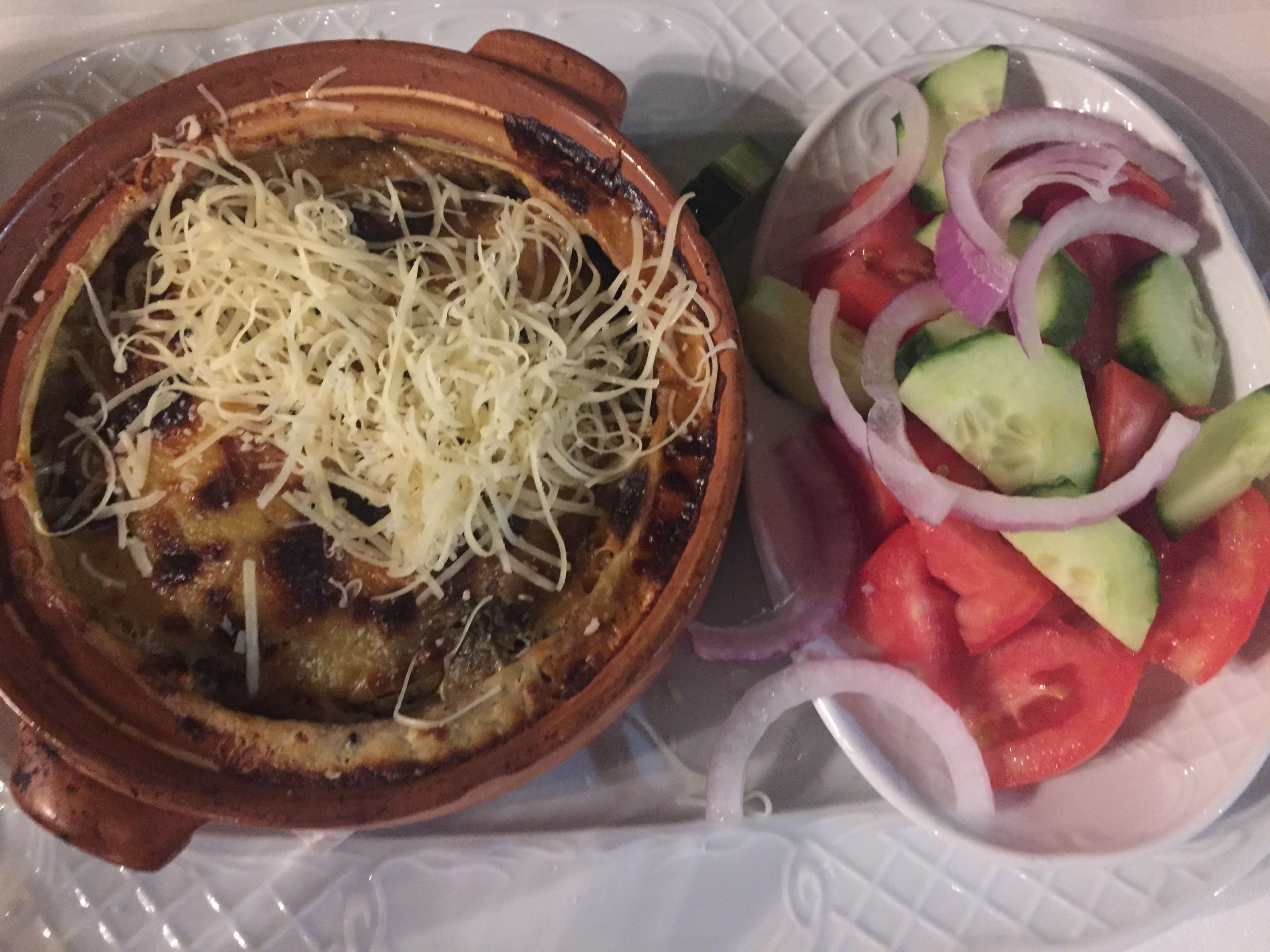 Musakka da Türkiye'de yapılandan farklı olarak en alta patates, üzerine kıyma, patlıcan ve beşamel sos dökülerek fırında yapılan güzel bir yemek. Fırın makarnaya çok benzetirim aslında. Yanında Yunanlıların meşhur tembel salatası Grek Salatadan esinlenen koca koca kesilmiş domates ve soğanlı bir salata ile geldi.