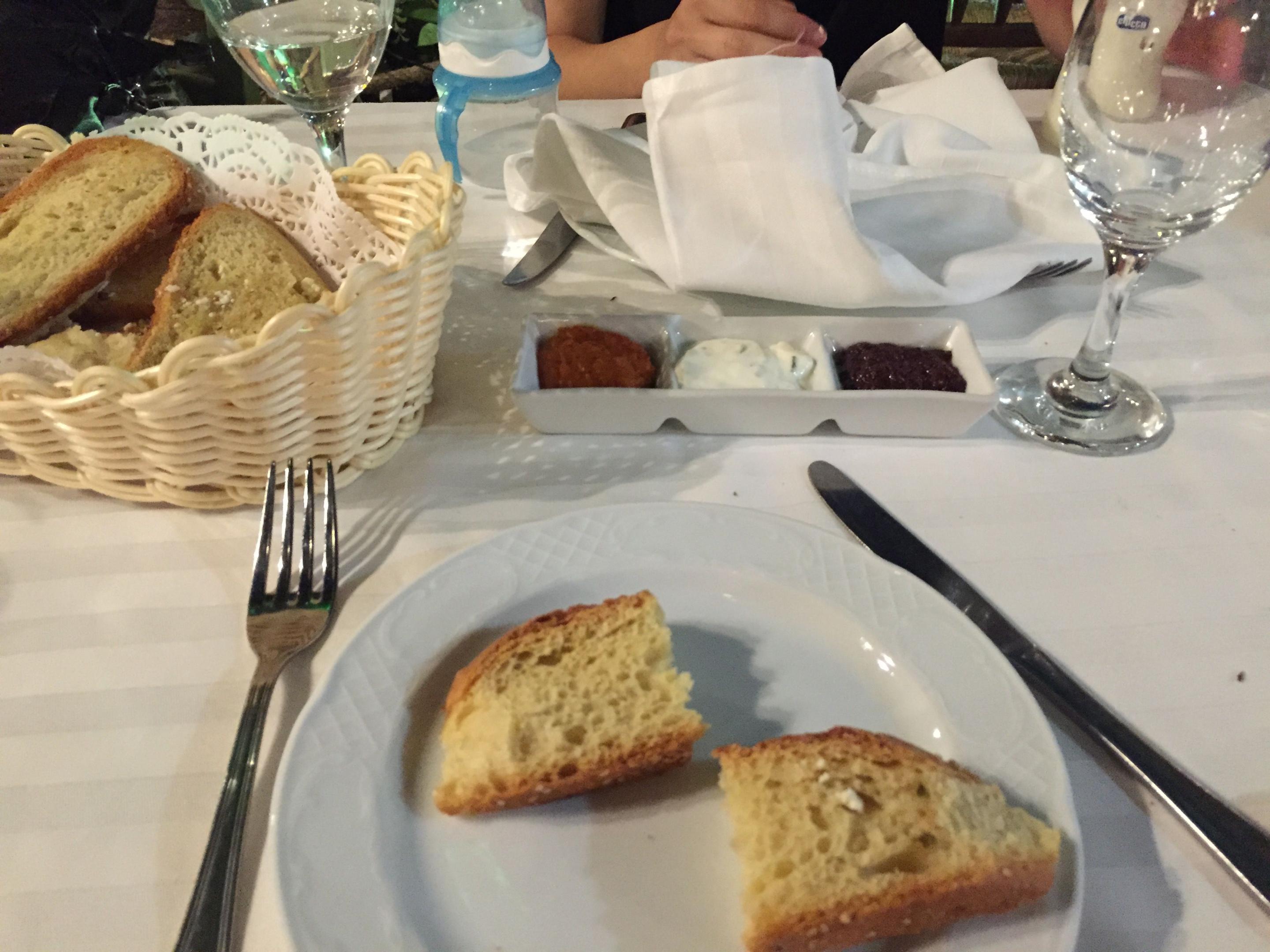 Masaya siz bir şey istemesiniz de zeytinyağlı ekmek ve ufak tadımlık mezeler getiriyorlar.